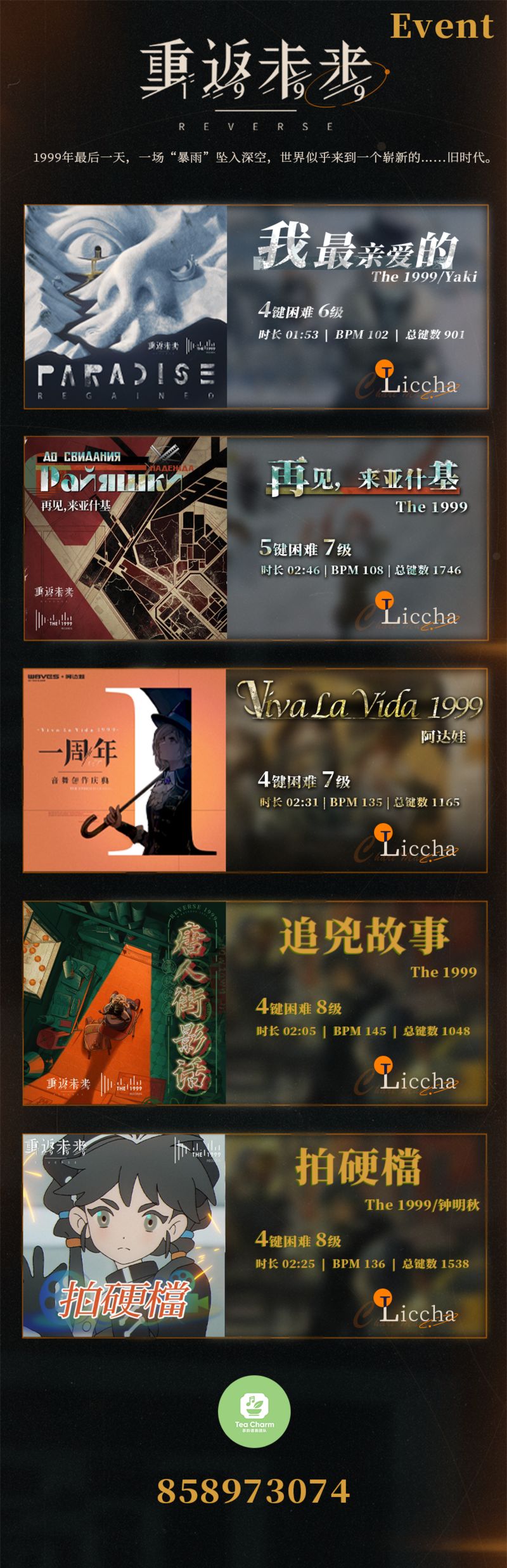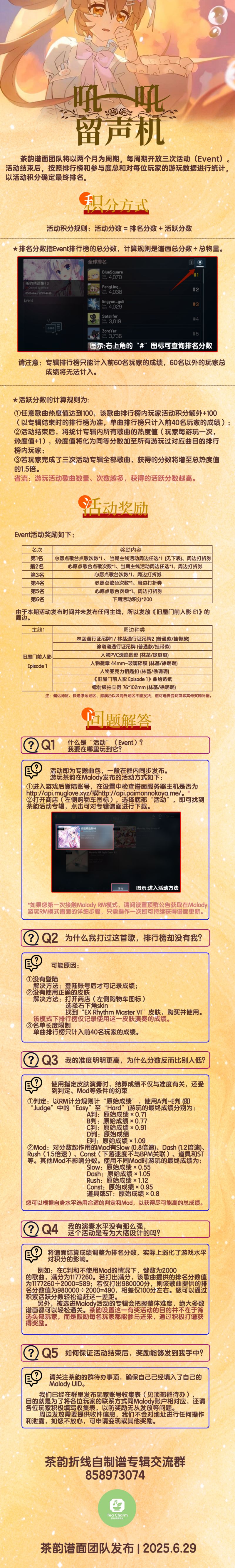 • 用MaV携带RM皮肤游玩每次活动中的谱面, 尽你所能取得高分. 每个谱面成绩除以该谱面的note数是活动积分, 总积分是谱面积分之和.